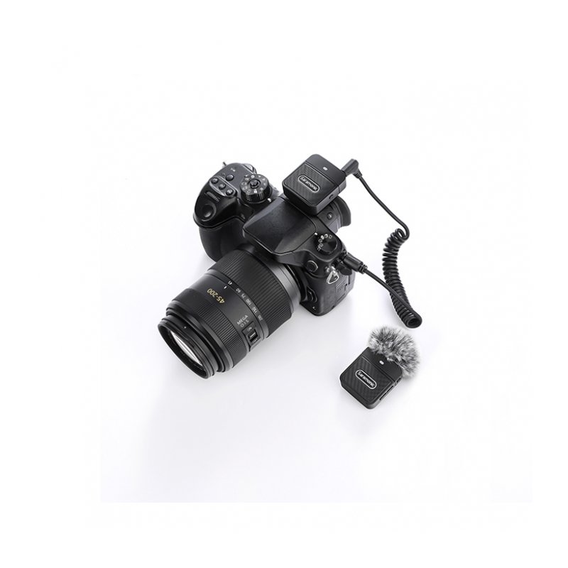 Работает в открытом диапазоне 2.4 ГГц с цифровым шифрованием сигнала, максимальная дальность составляет 50 м (в условиях прямой линии видимости между передатчиком и приемником). В передатчике размещен встроенный всенаправленный микрофон: просто закрепите его в районе груди и начинайте запись. Меховой экран эффективно защищает от проникновения в запись шума ветра. Также имеется режим цифрового шумоподавления (для его включения зажмите одновременно кнопки «+» и «–»).