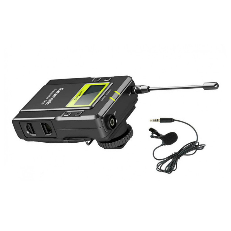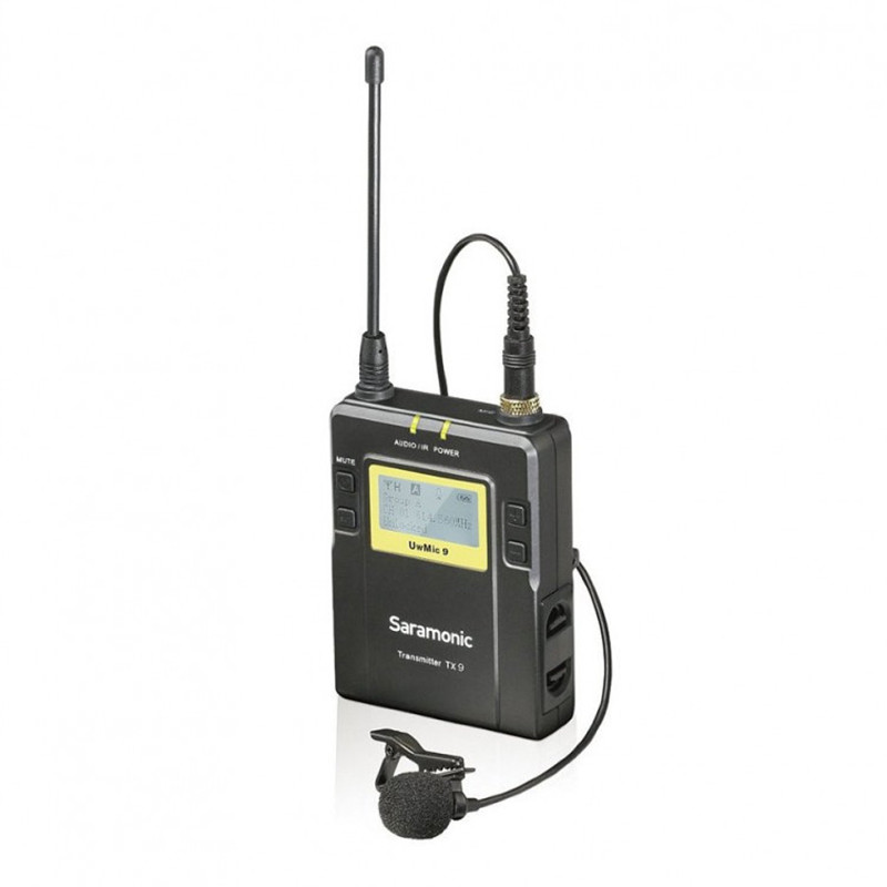 Saramonic UwMic9 TX9 совместим с ресивером RX9, его также можно использовать вместе с комплектом UwMic9 (RX9 + TX9) в качестве дополнительного беспроводного микрофона. В комплект входит один беспроводной передатчик с креплением на поясе и петличный микрофон с зажимом и ветрозащитой.