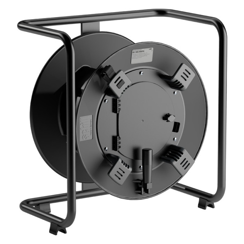 Schill SK 380.RMFK - Рамная кабельная катушка, с лючком на замке и внешним держателем кабеля, открытая рама, поворотная ручка, дополнительное отверстие в барабане D51 мм., предназначенное для продевания кабеля с разъемом в сборе.