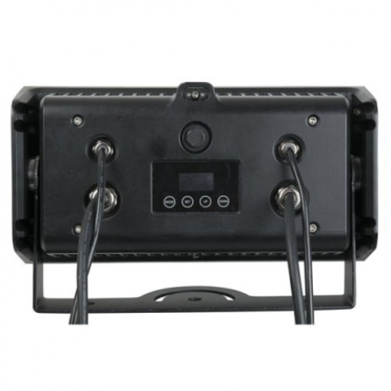 Без мерцания. В качестве источника света используются 15 RGBW светодиодов 4-в-1. Для управления режимами работы прожектора может быть применен протокол DMX512, имеется пара сигнальных разъёмов XLR 3-pin IP65 (вход и выход). Также предусмотрен сенсорный OLED дисплей (с защитной крышкой) с кнопками меню. Имеются возможность диммирования, строб-эффект. Охлаждение осуществляется при помощи естественной циркуляции воздуха. Электропитание от стандартной сети, разъёмы входа и выхода (для подключения сторонних устройств) IP65. Прочный корпус отлит под давлением из алюминия, с антикоррозионным покрытием. Для монтажа прожектора предусмотрена поворотная лира. К прожектору прилагается 1.5 м IP65 кабель питания с разъёмом Schuko.