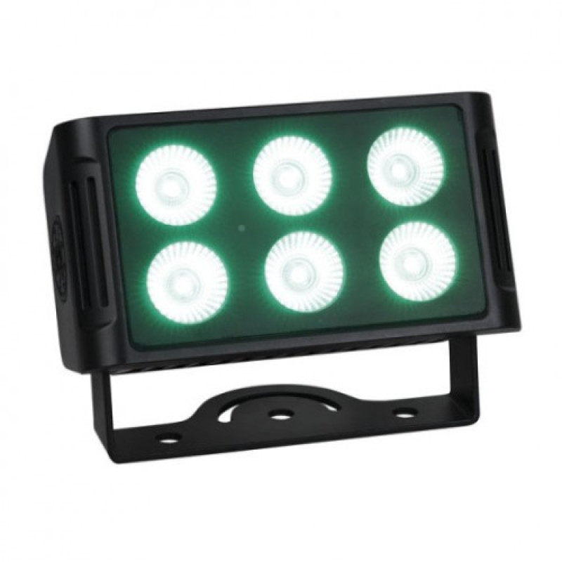 Без мерцания. В качестве источника света используются 6 RGBW светодиодов 4-в-1. Для управления режимами работы прожектора может быть применен протокол DMX512, имеется пара сигнальных разъёмов XLR 3-pin IP65 (вход и выход). Также предусмотрен сенсорный OLED дисплей (с защитной крышкой) с кнопками меню. Имеются возможность диммирования, строб-эффект. Охлаждение осуществляется при помощи естественной циркуляции воздуха. Электропитание от стандартной сети, разъёмы входа и выхода (для подключения сторонних устройств) IP65. Прочный корпус отлит под давлением из алюминия, с антикоррозионным покрытием. Для монтажа прожектора предусмотрена поворотная лира. К прожектору прилагается 1.5 м IP65 кабель питания с разъёмом Schuko.