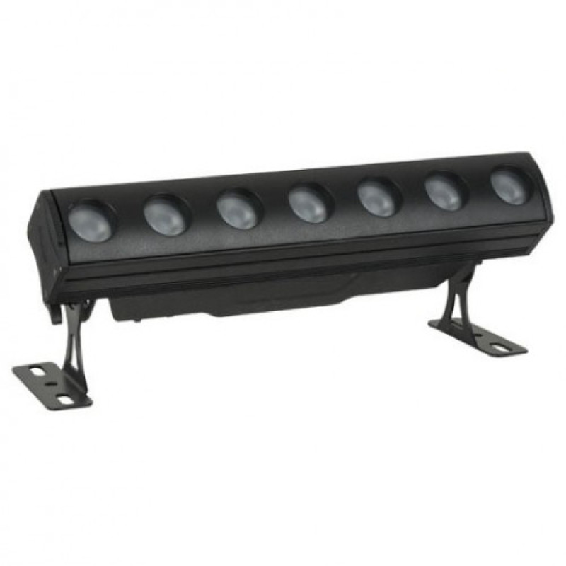 В качестве источника света используются 7 RGBW мультичипов с автономным управлением. Без мерцания. Управление может осуществляться по протоколу DMX512 через сигнальный вход XLR 3-pin, для иных устройств имеется аналогичный выход. Для ручной настройки предусмотрены OLED дисплей и кнопки меню. Присутствуют диммер и строб-эффект. Питание устройства осуществляется при помощи универсального автоматического интегрированного адаптера от любых стандартных сетей переменного тока, предусмотрены входной и выходной, для иных устройств, разъёмы Powercon (в соответствии с IP65). Охлаждение естественное, без применения вентилятора. Прочный корпус выполнен из алюминия с чёрным покрытием. Для монтажа устройства предусмотрены многофункциональные кронштейны. Дополнительно предлагаются рассеиватели с углами раскрытия луча 20°, 40°.