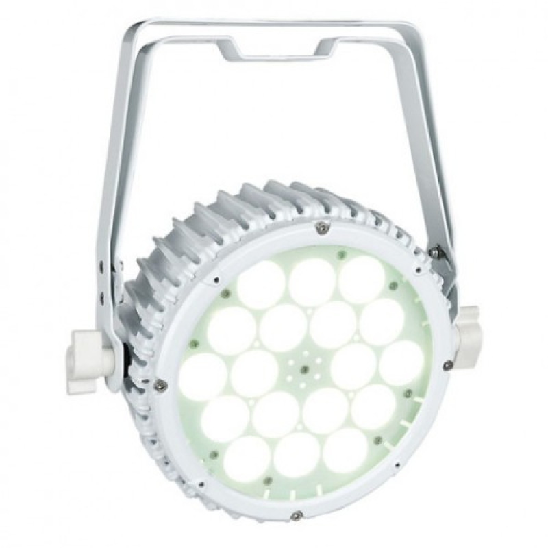 В качестве источника света используются 18 RGB мультичипов 3-в-1. Мерцание отсутствует. Управление гибкое. Возможно внешнее по протоколу DMX512, для чего на тыльной поверхности предусмотрены пара разъёмов XLR 3-pin (вход и выход). Для непосредственного управления там же имеются LED дисплей и кнопки меню. Предусмотрены также диммирование, строб-эффект, режим статичного света. Для звуковой активации устройства имеется интегрированный микрофон с регулировкой чувствительности. Охлаждение естественное. Питание обеспечивается от стандартных электросетей. Разъём IEC. Для подключения сторонних устройств предусмотрен выходной IEC разъём. Корпус прожектора выполнен из алюминия и стали. Универсальное двойное регулируемое крепление позволяет как напольную установку, так и подвес. В комплекте шнур питания 1.5 м.