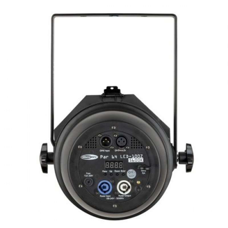 Коррекция угла раскрытия луча осуществляется вручную. Предполагается управление по протоколу DMX512, предусмотрены сигнальные входной и сквозной разъемы XLR 3-pin. Для ручной установки параметров имеется LED дисплей с кнопками меню. Предусмотрены регулировка яркости (диммирование) и строб эффект. Охлаждение принудительное, при помощи вентилятора. С интегрированным импульсным блоком питание, с входным и сквозным разъемами Pro Power. Прочный корпус выполнен из алюминиевого сплава. С рамкой для светофильтров. В комплект входит кабель питания с вилкой Schuko. Для монтажа SHOWTEC PAR 64 LED-100Z 5600K предусмотрена поворотная лира. Пригоден для эксплуатации в сухих, умеренно запыленных, помещениях.