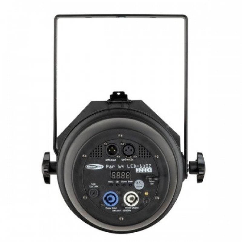 Коррекция угла раскрытия луча осуществляется вручную. Предполагается управление по протоколу DMX512, предусмотрены сигнальные входной и сквозной разъемы XLR 3-pin. Для ручной установки параметров имеется LED дисплей с кнопками меню. Предусмотрены регулировка яркости (диммирование) и строб эффект. Охлаждение принудительное, при помощи вентилятора. С интегрированным импульсным блоком питание, с входным и сквозным разъемами Pro Power. Прочный корпус выполнен из алюминиевого сплава. С рамкой для светофильтров. В комплект входит кабель питания с вилкой Schuko. Для монтажа SHOWTEC PAR 64 LED-100Z 3200K предусмотрена поворотная лира. Пригоден для эксплуатации в сухих, умеренно запыленных, помещениях.