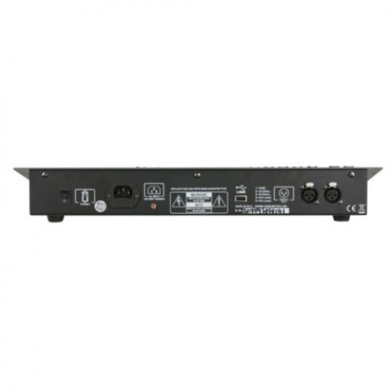 Консоль предназначена для управления 12 интеллектуальными световыми приборами с использованием протокола DMX512 по 32 канала на прибор. В устройстве предусмотрены 16 канальных фейдеров. Присутствуют 5 банков по 16 сцен (всего 80), 5 банков по 16 чейзов (всего 80), 100 шагов последовательности. Имеется USB порт (поддерживается FAT32). Произвольное распределение каналов по устройствам. Для ручной настройки имеется LCD дисплей с кнопками меню, функциональные кнопки и джог колёса. Для передачи сигналов управления предусмотрены разъёмы XLR 3-pin и XLR 5-pin. Питание осуществляется от стандартной электросети, предусмотрен разъём IEC, прилагается кабель питания 1.5 м. Корпус выполнен из металла и пожаробезопасного пластика. Рекомендуется установка в рэк 19˝ х 4U.