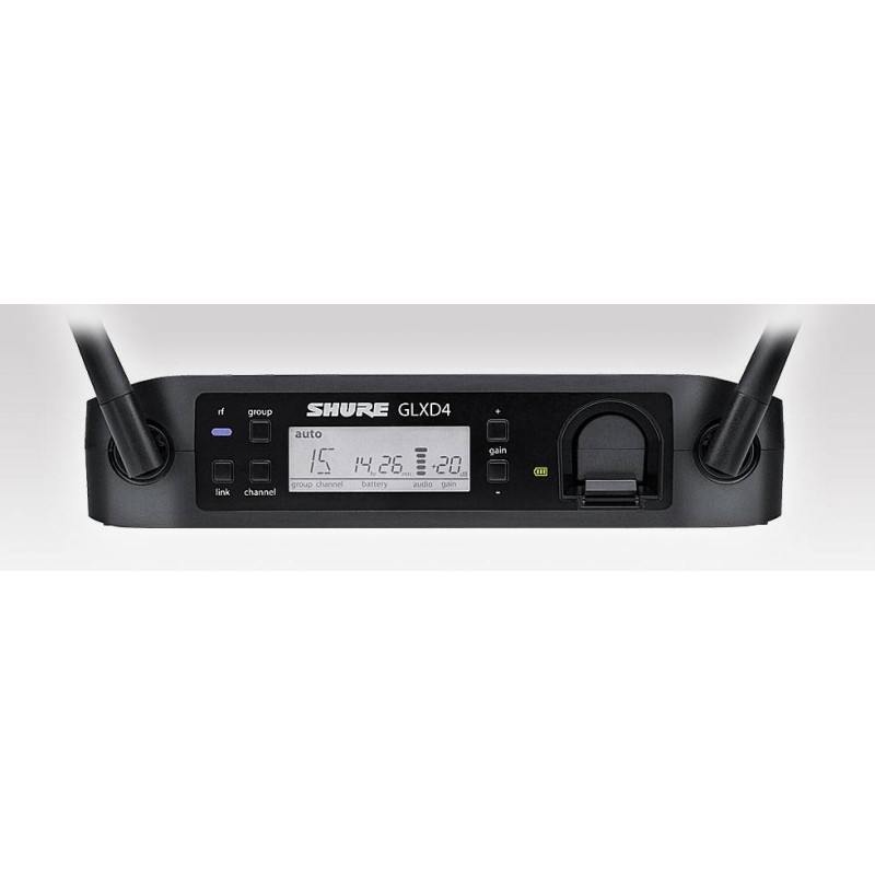 GLXD4 имеет маленький вес и компактные размеры, он может быть установлен на любой ровной горизонтальной поверхности. Корпус приемника сделан из ударопрочного литого пластика, оснащен 2 дипольными антеннами, которые принимают сигнал от передатчика. Передняя панель приемника оборудована ЖК дисплеем, на котором наглядно отображаются настройки и состояние системы. Также на ней GLXD4 имеется разъем для зарядки аккумулятора. На задней панели размещены кнопка включения, разъем для подключения электропитания, порт USB, микрофонный выход и инструментальный выход для соединения с усилителем, записывающей аппаратурой или микшером. Цвет корпуса приемника – черный.