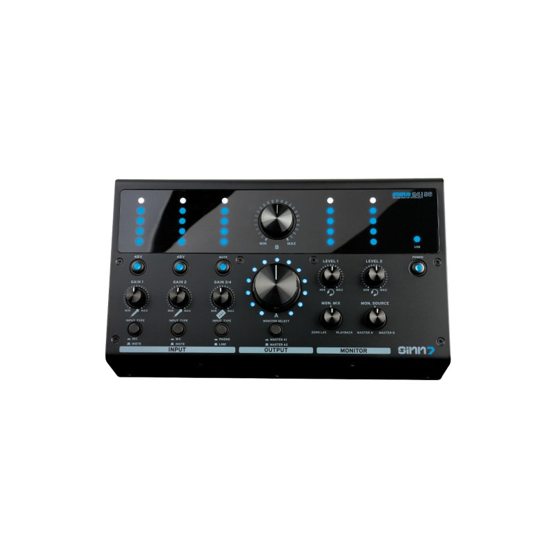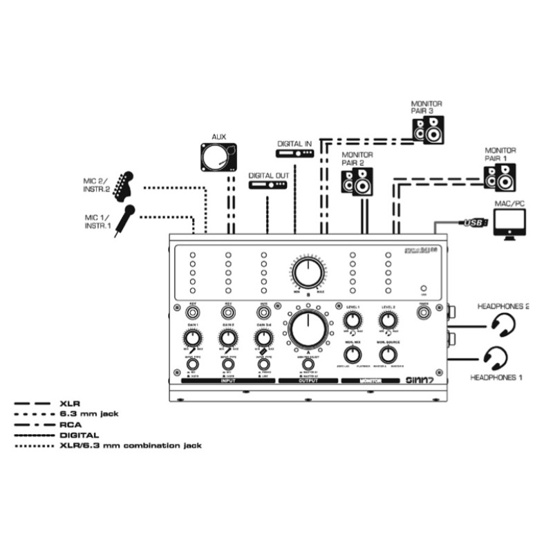 6х6 In / Out 24-bit/96kHz аудио интерфейс. 2x XLR / 6,3 мм Jack с фантомным питанием, 1 х стерео Phono (RCA) вход с винтом заземления GND и фоно / линейным переключателем, Цифровой вход / выход, гибкие выходы: монитор через XLR, TRS