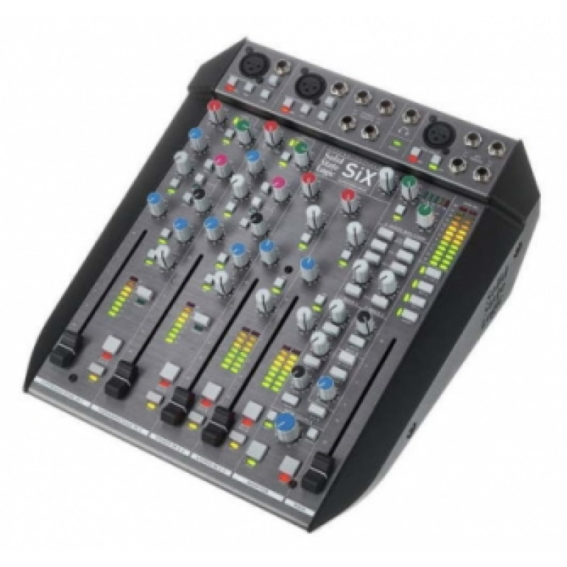 Solid State Logic SiX – аналоговая настольная консоль профессионального уровня, сочетающая в себе микшер и инструменты SSL под обработку звука. Предназначена для использования в студии, в постпродакшне, на сцене и для подкастинга. Имеется два канала записи с микрофонными предусилителями Super Analogue. Они обеспечивают усиление 66 дБ, низкий уровень шума и искажений при широком динамическом диапазоне. Для микрофонных входов есть настройки для включения фантомного питания и НЧ-фильтры, а в инструментальных входах поддерживается режим Hi-Z для изменения сопротивления. Предусмотрено одновременное использование до 12 каналов. Возможна маршрутизация входов и выходов, а также обработка их встроенными компрессорами (SSL Channel, G-Series Bus и Listen Mic) и 2-полосным эквалайзером. Контроллеры включают пять 100-миллиметровых фейдеров, комплекты регуляторов и кнопок управления. Поддерживается интеграция с рабочими станциями. Предусмотрены режимы Alternate и Talkback для дополнительных входов и выходов. Коммутационные возможности: два микрофонных входа XLR и два инструментальных входа TRS, вход Talkback XLR, выход для наушников, четыре разъема возврата, восемь входов TRS, два разъема DB25, два выхода XLR и шесть выходов TRS.