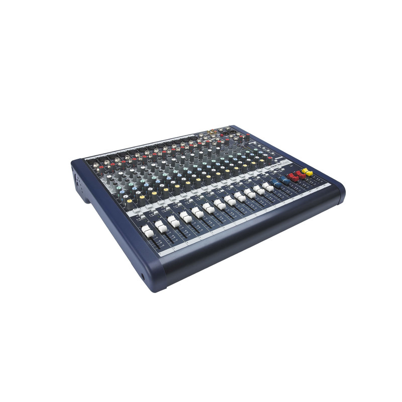 На борту Soundcraft MPMi 12/2 находится 12 входов XLR с предусилителями GB30. Линейные источники подключаются в небалансные TS-разъемы, также есть два стереоканала. На двенадцати основных каналах есть ручки гейна с усилением до 60 дБ, трехполосные полупараметрические эквалайзеры в виде ручек с усилением/ослаблением до +15/-15 дБ и канальные фейдеры уровня с усилением до +10 дБ. Наконец, на всех каналах есть светодиодные пик-индикаторы, показывающие опасное превышение уровня. На стереофонических каналах – трехполосные графические эквалайзеры. Выходы представлены двумя разъемами XLR-M, дополнительным стереовыходом MONITOR OUT на двух разъемах TS и TRS-выходом на наушники. Также в мастер-секции есть два разъема для суб-групп, два дополнительных RCA-входа 2TRK и RCA-выходы RECORD OUT. В мастер-секции можно также найти кнопку включения фантомного питания +48 Вольт, 10-сегментный двухканальный индикатор уровня со светодиодами клиппирования и мастер-фейдеры для регулировки уровня звука в выходном стереоканале.
