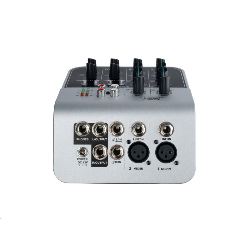 - Входное сопротивление: микрофонный 2.3кОм балансный, линейный 20кОм балансный, CD/RCA 24кОм небалансный.
