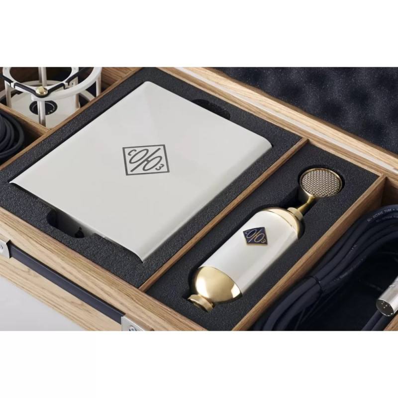 Микрофон поставляется в дубовом кейсе в комплекте с амортизатором, блоком питания и 5-метровым кабелем 6-pin. Опционально может поставляться с капсюлем круговой направленности.