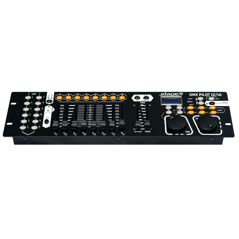 STAGE 4 DMX PILOT 12/16 ПРОГРАММИРУЕМЫЙ КОНТРОЛЛЕР УПРАВЛЕНИЯ ДИНАМИЧЕСКИМ СВЕТОМ.DMX Pilot 12/16 – программируемый контроллер управления динамическим светом. 12 приборов до 20 каналов каждый, 8 фейдеров прямого управления на 2 страницах и два колеса для точного позиционирования PAN/TILT или для управления дополнительными 4 каналами. Также в пульте реализована поддержка RDM (Remote Device Management - удаленное управление прибором). Возможности стандартных контроллеров расширены функцией свободного назначения параметров каналов, инверсией изменения значений каналов, кнопкой управления дым-машиной.