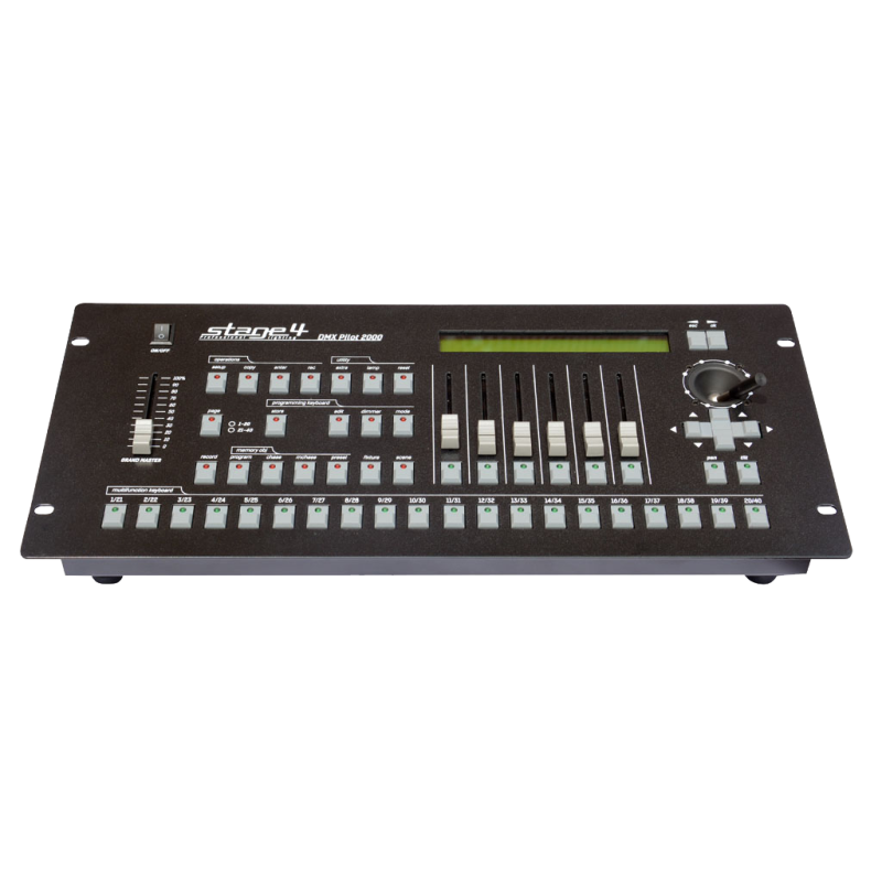 STAGE 4 DMX PILOT 2000 УНИВЕРСАЛЬНЫЙ КОНТРОЛЛЕР, ПОДХОДИТ ДЛЯ ОБШИРНОГО ДИАПАЗОНА ПРИМЕНЕНИЙ.DMX Pilot 2000 – универсальный и наиболее известный контроллер DMX-512 на рынке, способный управлять до 40 приборами (полноповоротные головы, сканеры, колорченжеры, диммеры и т.д.) до 36 каналов максимум, в общей сложности до 512 DMX-каналов с синхронизацией по МIDI, SMPTE, RS 232.Благодаря большому количеству встроенных редактируемых эффектов позволяет создавать потрясающие динамические сцены.Подходит для применения на объектах разного уровня: от концертных площадок до театров, клубов и телевизионных студий, от маленьких до больших шоу. При этом опыт работы с данным пультом есть почти у каждого ди-джея и светооператора.