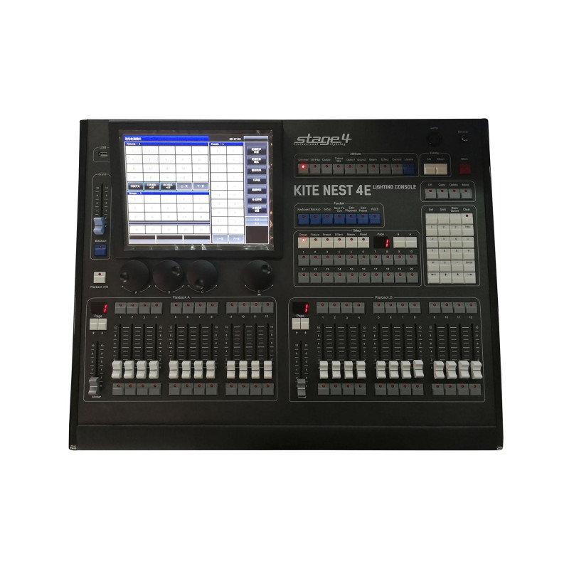 STAGE 4 KITE NEST 4E КОНСОЛЬ УПРАВЛЕНИЯ СВЕТОМ.Профессиональная консоль управления светом в компактном корпусе, сочетает в себе широкие возможности программирования световых шоу. KITE NEST 4E обладает возможностями и функциями современных технологий, применяемых в системах управления светом лидерами рынка. В одном устройстве совмещены сразу нескольких пультов, обычно используемых в этом классе. Не нужно отдельно докупать крыло фейдеров, отдельный монитор с тач-скрином, туровый кейс, миди кабель, подсветку – все есть в базовом комплекте поставки. Пульт управляет 4-мя полными потоками DMX-512, что удовлетворяет требованиям большинства средних объектов шоу индустрии.