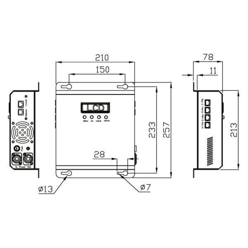 - Сигнальные входы: 2 х RJ45 для кабеля витая пара CAT5 / выход: 4 х RJ45.