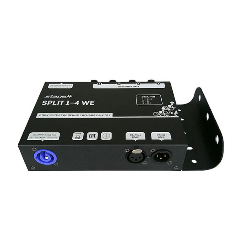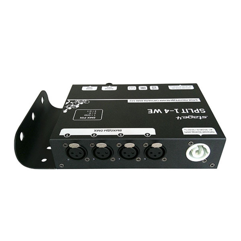 Stage4 Split 1-4 WE - Это сплиттер с одним DMX-входом, одним сквозным DMX-выходом для подключения к следующему сплиттеру и четырьмя изолированными выходами.