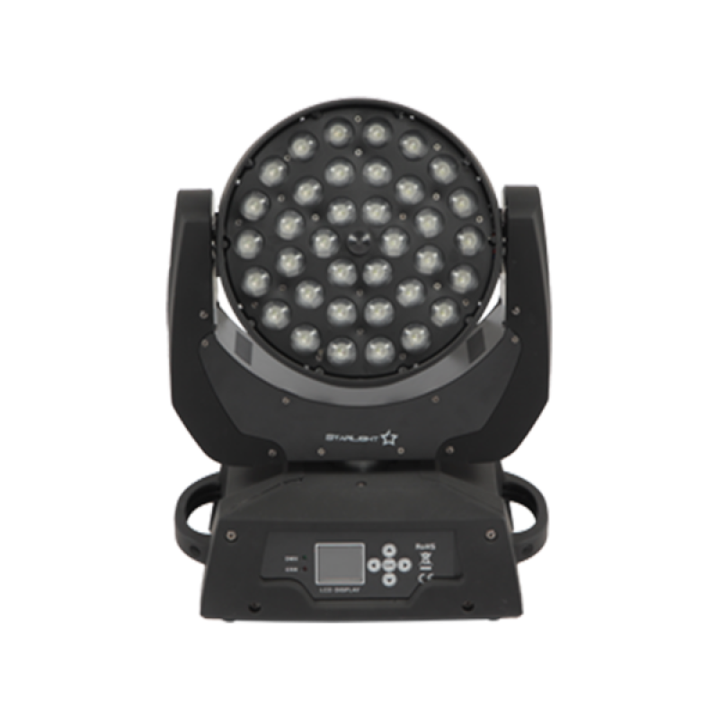 Вращающаяся голова Starlight MH3610ZW представляет собой профессиональное светодиодное оборудование фокусированного света с полным движением, предназначенное для сопровождения различных световых шоу и программ.
