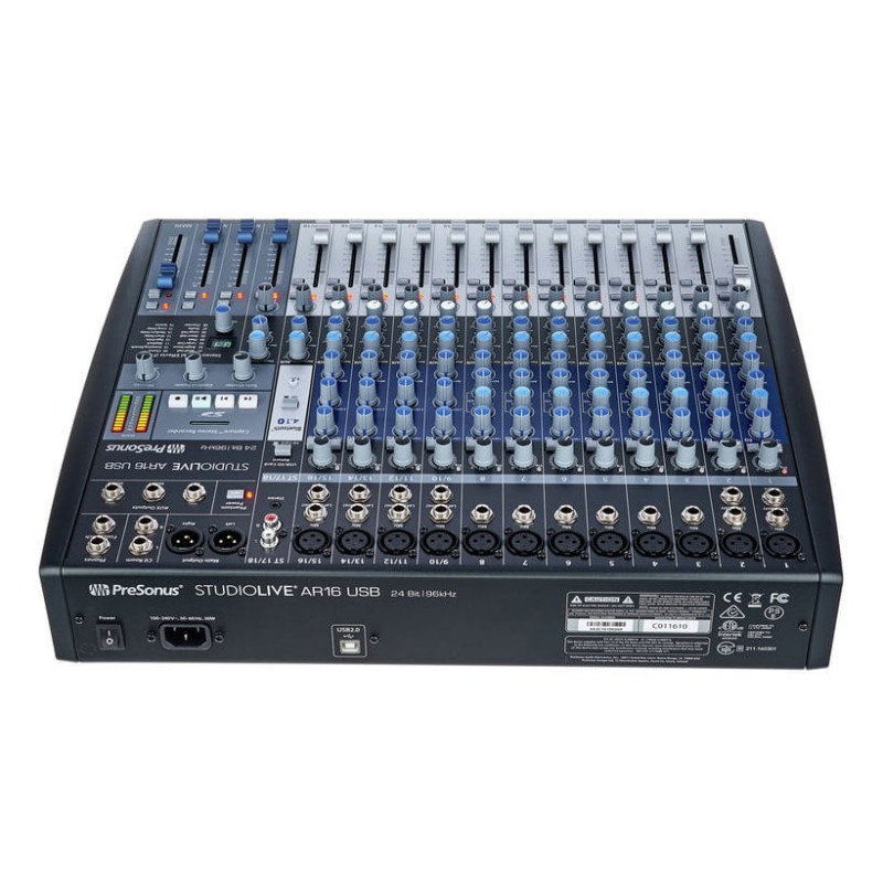 StudioLive AR16 USB гибридный микшер на 18 каналов. Консоль предназначена для студий, репетиционных помещений или концертов. Встроен процессор эффектов, рекордер SD на 2 дорожки, звуковой многоканальный интерфейс под шину USB 2.0 и адаптер Bluetooth, обеспечивающий ведение беспроводного аудио-стриминга с мобильных гаджетов. Главные преимущества StudioLive AR16 USB: Встроено 12 предусилителей A-класса. На каналах 1 и 2 имеются инструментальные входы Hi-Z под прямое включение гитары/баса. Рекордер SD на две дорожки обеспечивает запись микса main без подсоединения к ПК (поддержка карт до 32 ГБ). Под ПК и Mac есть звуковой многоканальный интерфейс USB (24 бит/96 кГц). Процессор стереоэффектов DSP оснащен 16 пресетами. Миниджек под медиаплеер и стереоканал Super Channel с входными разъемами 2xRCA. Режим проигрывания аудио с рекордера SD, подсоединенного к ПК через USB/ Bluetooth. На входных каналах полупараметрический эквалайзер на 3 полосы, фильтр low-cut, кнопки PFL и Mute, регуляторы панорамы. Шины: одна эффектов и две мониторные. Фейдеры на 60 мм. Можно поставить в рэк. Металлический корпус. Встроен универсальный источник питания. Интеграция с идущим в комплекте ПО для многодорожечного записывания DAW Studio One 3 Artist и Capture.