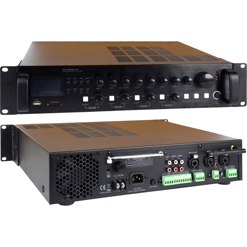 Радиоузел трансляционный на 4 регулируемых зоны, мощность усилителя 360 Вт, встроенные MP3, USB, FM, SD Card, Bluetooth. Работа по 100В/8Ом линиям, фантомное питание на Mic1/Mic2 (отключаемое), переключатель пожарной тревоги/оповещения (Chime).
