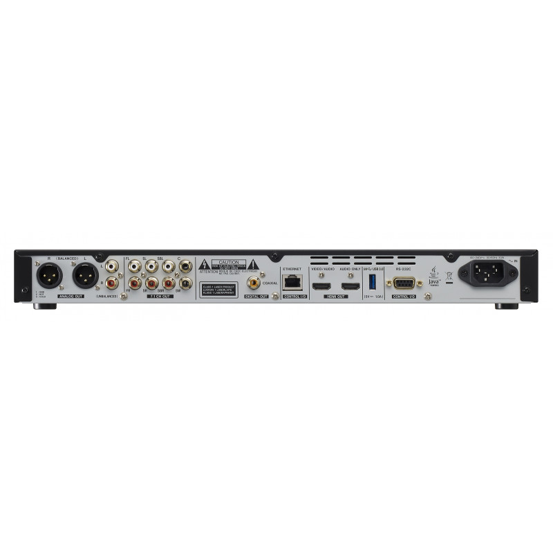 В дополнение к дистанционному управлению функции воспроизведения доступны с передней панели. Также имеются отдельные функции блокировки, привода и ИК-пульта дистанционного управления (входит в комплект поставки) для предотвращения случайных изменений или несанкционированного использования. Подключение мониторов или телевизоров осуществляется через два выходных порта HDMI с функцией plug-and-play на задней панели, которые поддерживают форматы HDMI версий 2.0 и 1.4 (только для аудио). Для подключения объемного звука в формате 7.1 доступны выходы RCA, для вывода балансного аудиосигнала имеются выходы 2 x XLR, в дополнение к которым рядом расположены небалансные выходы 2 x RCA. Для вывода цифрового аудио доступен дополнительный коаксиальный выход RCA S/PDIF, который поддерживает аудиоформаты профессионального уровня, включая Dolby, DTS и двухканальный линейный PCM. Вес устройства составляет 2,8 кг.