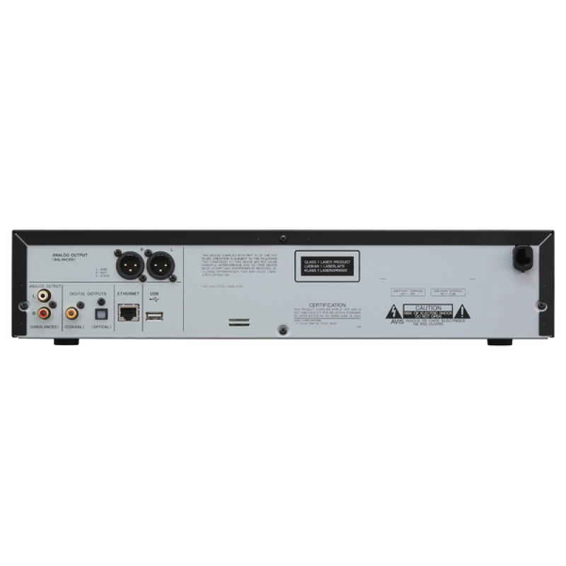 Он разработан для установки в рэк и обладает высотой 2U. Для большего комфорта при управлении устройством в комплект входит пульт дистанционного управления. Основная «фишка» проигрывателя – поддержка массы других форматов, которые можно читать как с USB-накопителя, так и по локальной проводной сети, и по беспроводной. Также можно подключать внешние устройства Apple iPod и iPhone с использованием фронтального входа на разъеме USB. Данный проигрыватель оснащен балансными выходами в дополнение к обычным небалансным: это два XLR-разъема на задней панели.