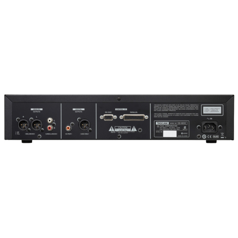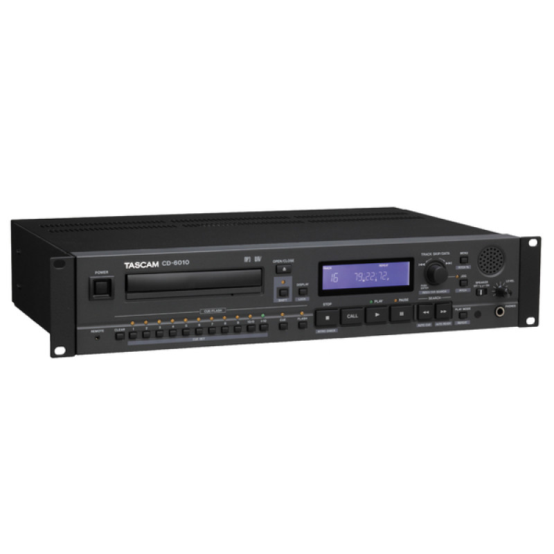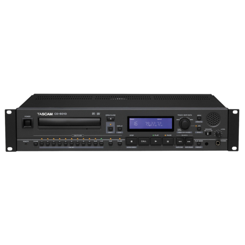 TASCAM CD-6010 оснащен CD-приводом, который может работать как с компакт-дисками формата CDDA, так и с дисками, содержащими MP3-файлы с битрейтом до 320 Кб/с и WAV-файлы. Данные файлы поддерживаются с частотой дискретизации до 48 кГц. Возможно отображение информации формата CD-text и ID3-тэгов: плеер обладает многострочным графическим ЖК-дисплеем, который может показывать необходимую информацию. Функция EOM (End of Message – «сообщение об окончании») уведомляет о времени, через которое закончится воспроизведение дорожки (от 10 до 90 секунд). Также можно ставить до 20 меток для быстрого старта и назначать трекам fade-in/fade-out в диапазоне от 0 до 10 секунд с шагом в полсекунды.
