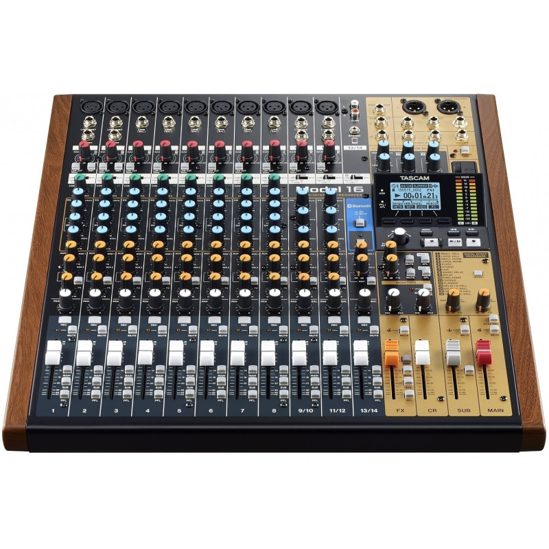 TASCAM MODEL 16 аналоговый 10 канальний микшер с цифровым 12 канальным SD рекордером, Bluetooth, процессор эффектов, 7 полосный эквалайзер, размеры 465 mm × 400 mm × 160 mm, вес 4,3 кг, возможность монтажа в рек .