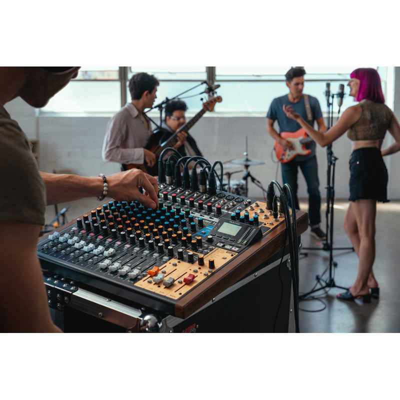 Model 16 имеет частотный диапазон 20 Гц – 30 кГц и поддерживает работу в режиме 24 бит / 48 кГц. Микшер оснащен 15 фейдерами (60 мм), 10 микрофонными XLR входами с 10 высококлассными предусилителями Ultra-HDDA, 2 инструментальными Hi-Z входами, выходом для наушников, 12 линейными TRS входами, 8 TRS выходами (AUX, Sub, FX, Room), RCA разъемами, 2 XLR выходами и большим количеством кнопок и регуляторов. Для контроля и управления параметрами устройства также имеется небольшой дисплей.
