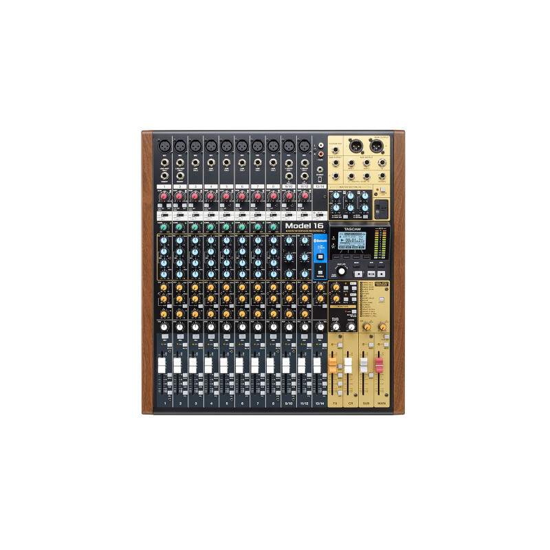 Консоль может подключаться через USB порт к ПК для работы в качестве аудиоинтерфейса и позволяет осуществлять передачу звука через Bluetooth V5 на мобильные устройства. Помимо этого, возможно осуществлять одновременную запись до 16 дорожек на SD / SDHC / SDXC карты размером до 128 ГБ. Для обработки звука Model 16 предлагает встроенные эквалайзеры, компрессор и дополнительную секцию эффектов. Габариты микшера составляют 430 х 113 х 463 при массе в 7 кг.
