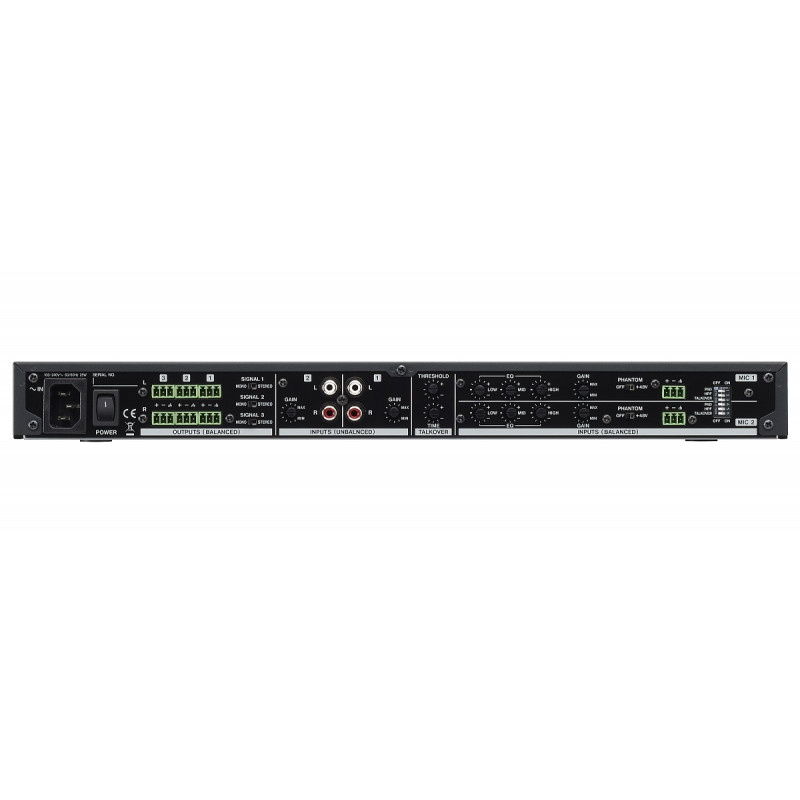 Три входных канала воспроизведения музыки, в том числе один вход AUX / Bluetooth, а также два входных микрофонных канала, обеспечивают широкий спектр возможностей фоновой музыки и маршрутизации объявлений. Это позволяет направлять дискретные миксы фоновой музыки и объявлений в отдельные зоны в широком спектре коммерческих приложений, включая магазины, рестораны, бары, кафе и отели. Входы стерео LINE 1 и 2 (RCA, несбалансированный) позволяют подключать проигрыватели компакт-дисков. Вход AUX / Bluetooth на канале 3 позволяет подключить дополнительный источник звука, например планшет, смартфон или другое устройство, через Bluetooth или мини-штекер 3,5 мм. На задней панели расположены три пары сбалансированных стереофонических выходных разъемов Euroblock, а также конфигурационный переключатель MONO / STEREO для каждого выхода. Каждый входной канал аудиопрограммы имеет кнопку выбора зоны на передней панели (1,2 или 3) с регулятором громкости. Каналы 1 и 2 также имеют индикаторы уровня PEAK и SIGNAL. Когда выбрано, кнопка маршрутизации зоны назначает выбранный выход и / или сигнал MIC для желаемой зоны. Два входа MIC, оба с подключением к евроблоку на задней панели, облегчают функции оповещения или наложения голоса. Кроме того, MIC 1 предлагает комбинированный разъем XLR-TRS на передней панели для удобного подключения. Оба MIC 1 и 2 поддерживают подключение фантомного питания + 48 В. Интеллектуальная функция Talkover автоматически распознает уровень сигнала MIC и ослабляет уровни фоновой музыки в целевой зоне во время объявлений. Управление порогом и временем на задней панели можно отрегулировать, чтобы установить точку ослабления и восстановления фонового аудио после объявления. Дополнительные настройки включают в себя 3-полосный эквалайзер с регулировками низкого, среднего и высокого уровней, настройку уровня усиления для входов Euroblock MIC, а также переключатели PAD, High Pass и Talkover ON / OFF.