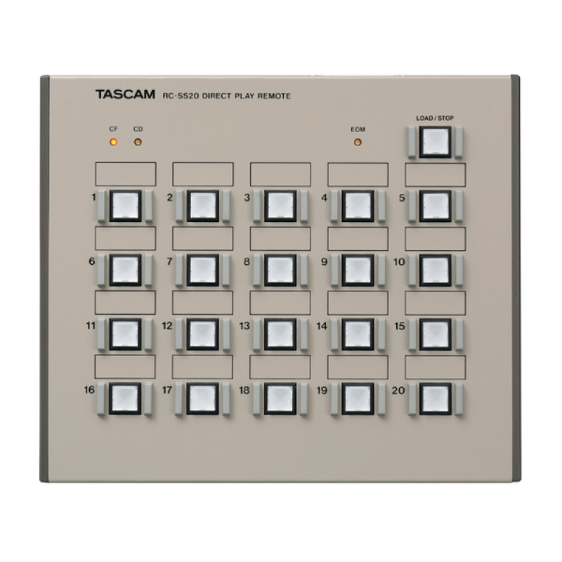 На поверхности TASCAM RC-SS20 есть можно увидеть кнопку STOP/LOAD для предварительной загрузки и остановки воспроизведения. Всё это заключено в корпус шириной 237 мм, а на тыловой панели есть два разъема DSub 25-pin для подключения кабелей связи с головными устройствами. Есть светодиодные индикаторы состояния.