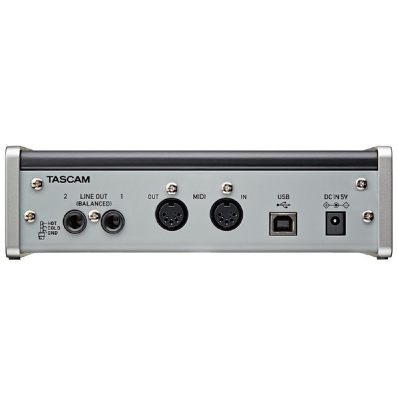 Выходы в TASCAM US-2x2 представлены двумя балансными разъемами типа TRS 1/4” Jack, расположенными на тыловой панели. Там же есть гнезда MIDI-интерфейса in/out на DIN5, гнездо USB типа B и разъем адаптера питания 5В. Есть вход для наушников на разъеме TRS 1/4” Jack, к нему можно получить доступ с фронтальной панели.