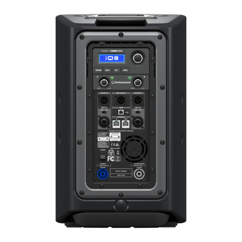Кабинет Turbosound iQ8 состоит из 8-дюймового НЧ-динамика с катушкой низкой массы для быстрого отклика и компрессионного высокотемпературного ВЧ-драйвера 1”, у которого есть алюминиевая звуковая катушка с медным покрытием. Волновод обеспечивает дисперсию в 90х90 градусов. Максимальная мощность составляет 2500 Ватт, при этом обеспечивается звуковое давление в 128 дБ.