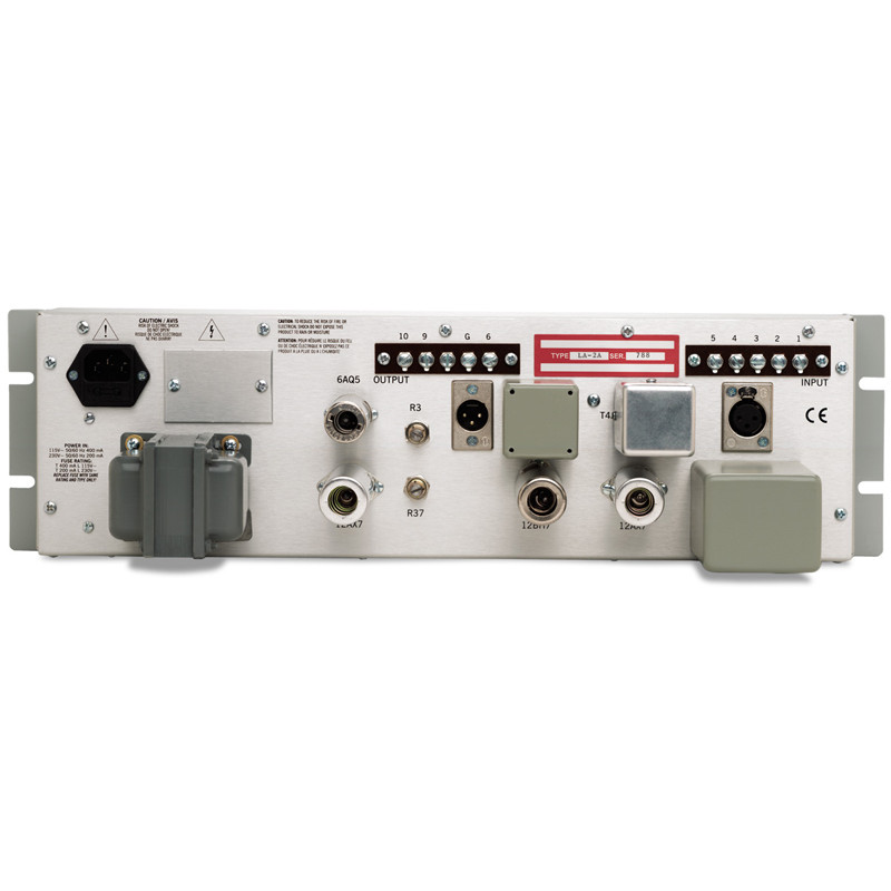 UNIVERSAL AUDIO LA-2A Leveling Amplifier занимает три рэка в высоту и имеет симметричные вход и выход, которые выполнены на разъемах XLR, а также на винтовых контактных колодках. Разъемы располагаются на задней панели, среди прикрепленных к ней снаружи трансформаторов и электронных ламп. Входное и выходное сопротивление может изменяться между 50, 150, 250 и 600 Ом. На передней панели располагаются переключатель режима работы (Compress / Limit) и подстроечный резистор, которым устанавливается время восстановления в пределах от 0,5 с до 5 с. Время срабатывания фиксированное и составляет 10 мкс. Есть регулятор входного уровня, регулятор уровня подавления, а также переключатель номинального выходного уровня (-10 дБв, +4 дБ или +16 дБ). Уровень подавления отображается на большом стрелочном индикаторе. Кроме перечисленных органов управления, на передней панели устройства расположен выключатель питания. Возможности LA-2A включают имитацию работы лампового оптоэлектронного компрессора / лимитера с переключением режима работы (Compress / Limit), изменением коэффициента усиления от 0 до 40 дБ, регулировками входного уровня (до +16 дБ) и программно-зависимых параметров времени срабатывания (от 10 мс), восстановления (от 0,06 до 5 с) и