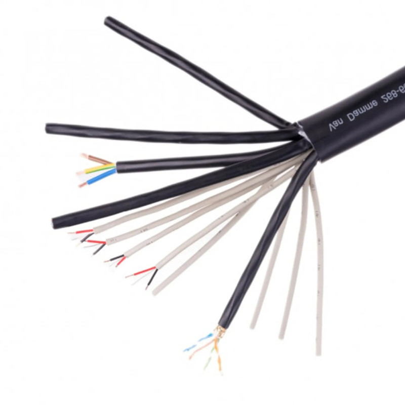 2 варианта с питанием — 2 кабеля Cat 6A, 4 пары 110 Ω, кабель питания 3 x 2,5 мм² и 4 Cat 6A, 8 пар 110 Ом, кабель питания 3 x 2,5 мм². Кабельные элементы F / UTP Cat со сплошным проводником 23 AWG поддерживают канал Gigabit Ethernet на расстоянии 100 метров, что идеально подходит для обычных сетевых протоколов, используемых в цифровом аудио и видео. Аудиопары 110 Ом также подходят для протокола DMX512 и передачи данных.