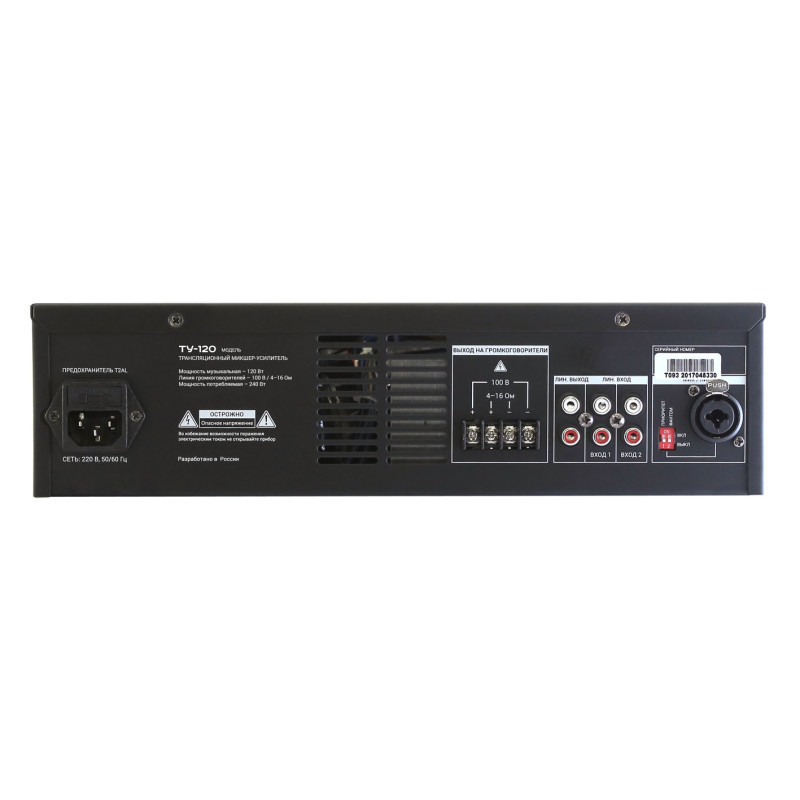 - Выход для подключения линии громкоговорителей с напряжением 100 В или подключения акустических систем с импедансом 4‑16 Ом.