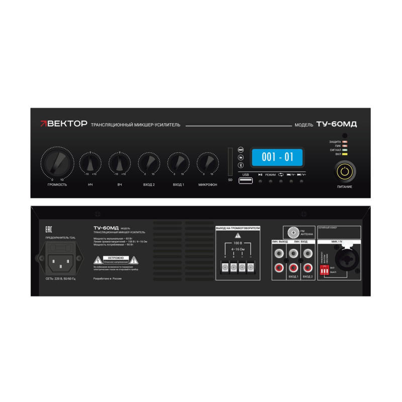 ВЕКТОР ТУ-60МД - Это комбинированный трансляционный микшер-усилитель класса D, который предназначен для построения небольших систем фонового музыкального вещания и речевой трансляции.