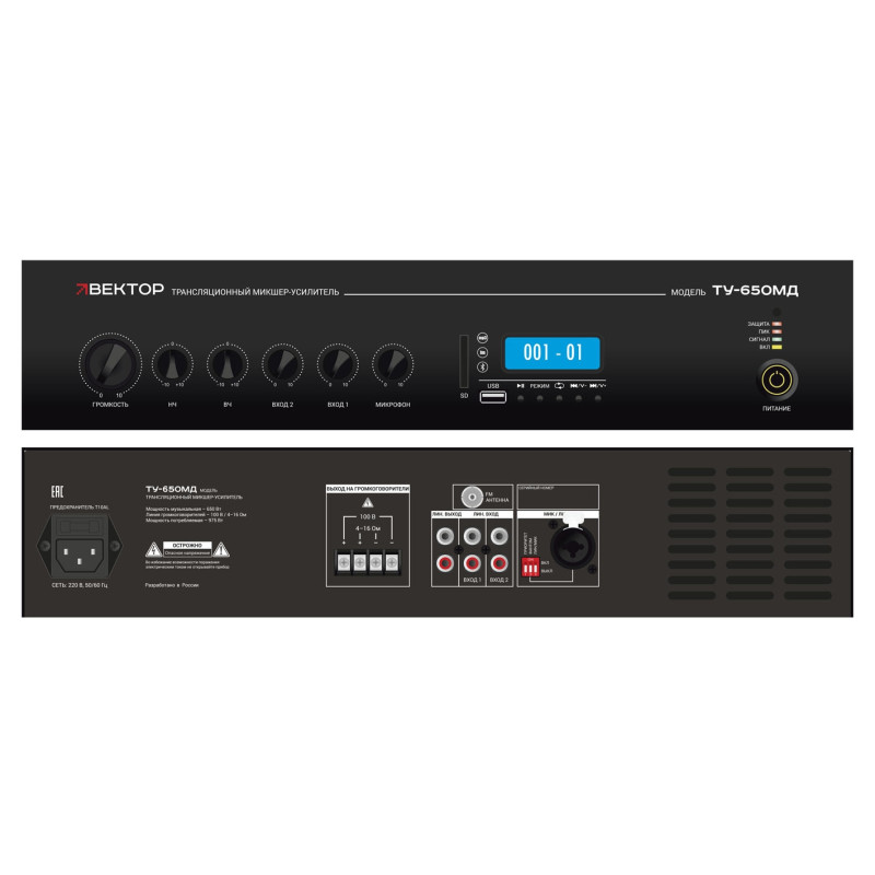 ВЕКТОР ТУ-650МД - Это комбинированный трансляционный микшер-усилитель класса D, который предназначен для построения небольших систем фонового музыкального вещания и речевой трансляции.