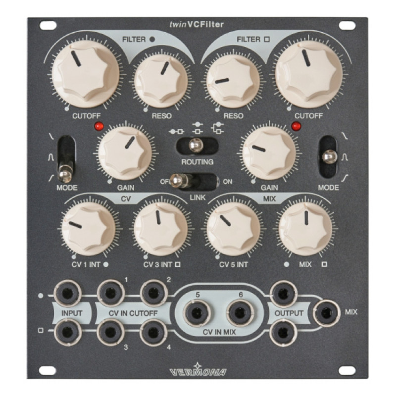 Многомодовые схемы TwinVCFilter предлагают высоко- и низкочастотные режимы с наклоном -12 дБ на октаву плюс -6 дБ полосовой режим. Кроме того, что они используются отдельно, можно параллельно или последовательно соединять этапы. Таким образом, пользователи могут создавать нижний предел -24 дБ соответственно с верхним или нижним диапазоном или с -12 дБ, соответственно с режекторным фильтром с индивидуально регулируемыми наклонами. Благодаря функции связи модуля, стереоматериал можно обрабатывать так же удобно, как монофонические волны. Потенциометры усиления позволяют пользователям выравнивать входящие сигналы. Высокие значения приводят к сильным искажениям. Используя секцию микширования, можно перекрестно перефразировать между обоими каналами фильтра. Для выключения сигналов отдельно, есть два отдельных выхода. Параметры отсечки и смешивания снабжаются двумя входами CV каждый. Некоторые из них имеют аттенюаторы.