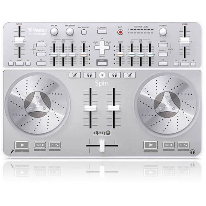 USB MIDI контроллер для DJ, два сенсорных Jog's высокого разрешения, аудио интерфейс 24бит/48кГц, RCA стерео выход, выход на наушники, 30 контактный разъем Apple, USB, совместимость c MacOS X 10.6, iOS6, поддержка iPad, iPhone, iPod, ПО djay for Mac
