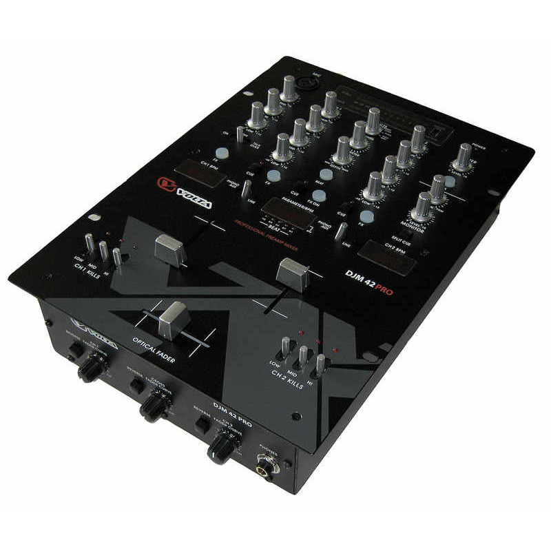 - 2 лин./фоно входа + 1микрофонный вход, толковер, оптические фейдеры, регулируемый цифровой процессор эффектов.