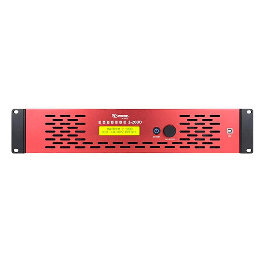Усилитель MAXIMUM 2-2000 имеет встроенное, интуитивно понятное меню для проведения детализированных настроек. В месте установки прибора это делается с помощью дисплея и кнопки управления на лицевой части; дистанционно - через специализированное ПО (приложение для Android или ПК), подключение к сети Ethernet (протоколы TCP/IP) посредством разъемов 2х RJ-45. Опционально можно добавить модуль Dante (коннекторы 2х RJ-45), что позволит увеличить количество управляемых прибором устройств до 128.