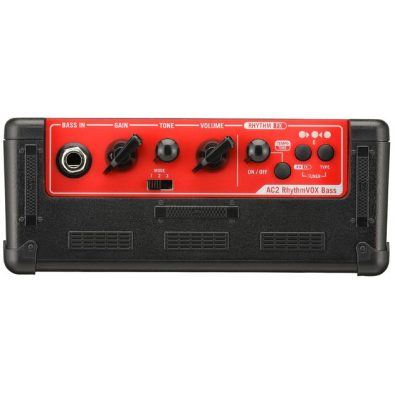 VOX AC2 RYTHMVOX-BASS миниатюрный комбоусилитель для бас-гитар из популярной серии Rhythm VOX. Этот усилитель отличается великолепным качеством звука и имеет удвоенную мощность по сравнению с предшественником AC1 – 2 Вт. Предусмотрены возможность выбора одной из трёх вариантов настройки эквалайзера для формирования разного звука: Normal, Flat и Scoop, а также использования пяти эффектов: реверберация, хорус, дилей, хорус+дилей и хорус+ревербератор. Девять различных ритмических рисунков и 9 музыкальных стилей дают в совокупности 81 вариант звучания. Можно задать темп от 40 до 240 ударов в минуту. Модель заключена в прочный корпус черного цвета. Внутри корпуса расположены два высококачественных 3-дюймовых динамика с сопротивлением 8 Ом. Возможности коммутации предусматривают один инструментальный моно-вход 1/4 джек, вход AUX (мини-джек) и разъем для подключения наушников. AC2 Rythm VOX Bass - портативная модель, электропитание которой может осуществляться как от адаптера переменного тока 9В, так и от батарей. Примерное время непрерывной работы от 6 батарей АА – 20 часов. Вес этого мини-усилителя – всего 620 грамм.