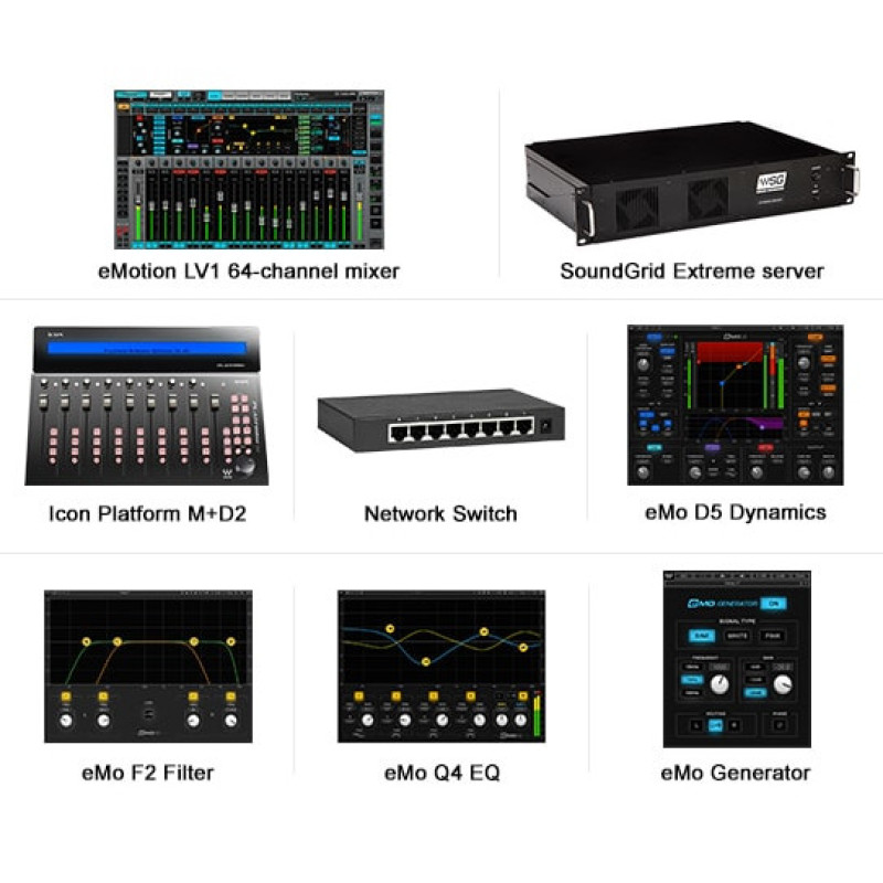 Комплект: SoundGrid Extreme Server сервер плагинов, eMotion LV1 64-канальный виртуальный микшер, контроллер Platform M, ЖК-дисплей Platform D2, Netgear 8-портовый коммутатор, кабель Cat 6, 4 плагина: eMo D5 Dynamics, eMo Q4 Equalizer, eMo F2 Filter и eMo Generator.