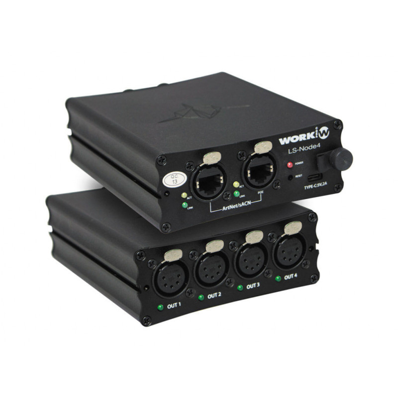 Данное устройство представляет собой узел двухсторонней передачи потока данных протоколов DMX/RDM через сеть Ethernet с полнофункциональной поддержкой протоколов ArtNet и sACN. Для максимально гибкой конфигурации системы LS-NODE4 включает в себя 2-портовый Ethernet-коммутатор. Данная модель, имеющая 4 порта DMX/RDM, что соответствует 4 пространствам DMX, полностью совместима с системами управления WORK LightShark LS-1 и LS-Core.