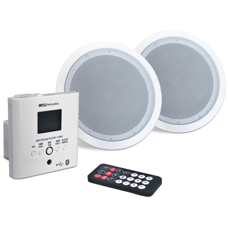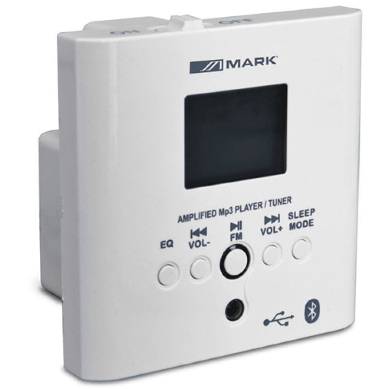Настенный усилитель (класс D) имеет выходную мощность 2 x 5 Вт (8 Ом) и предлагает выбор источников входного сигнала: USB-устройство для файлов MP3 (вход USB находится внизу коробки), FM-тюнер или соединение Bluetooth. Его ЖК-экран отображает полную информацию, включая идентификационную метку и время отслеживания. Кнопки позволяют перемещаться между треками, выбирать радио и регулировать громкость. Он встроен в коробку для крепления к стене.