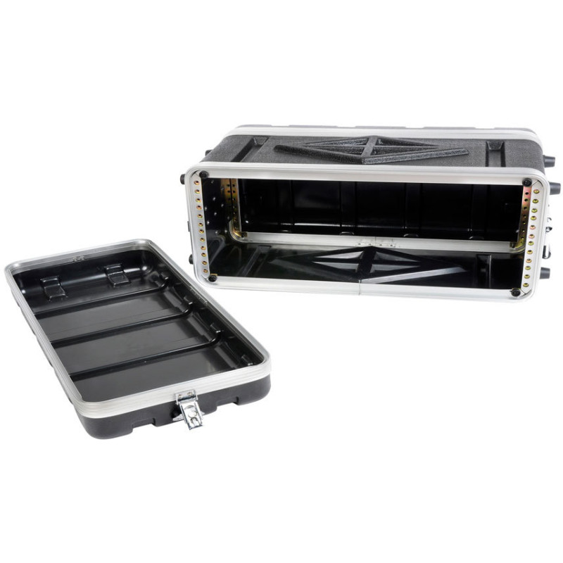 Транспортный рэковый кейс из жесткого пластика ABS. Возможность штабелирования. Боковые ручки и замки повышенной прочности.
