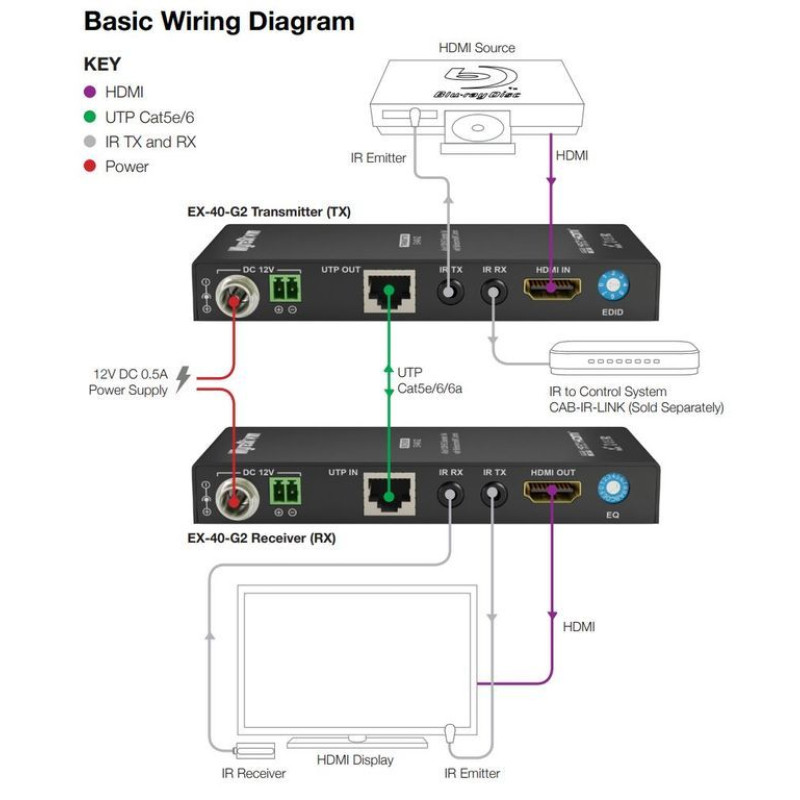 Комплект из передатчика и приемника сигналов HD видео, аудио и двунаправленного ИК по одному кабелю витой пары cat5e/6 на расстояние до 40 метров. Поддержка управления EDID на передатчике и управление эквалайзером на приемнике, совместимость с HDCP.