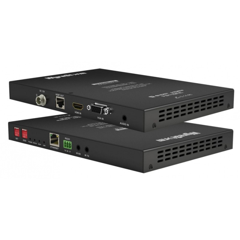 Комплект приемника и передатчика-коммутатора, работающих по технологии HDBaseT. Позволяют передавать HD видео, аудио, Ethernet, двунаправленные RS-232 и ИК, а так же питание на расстояние до 70 метров для 4K и до 100 метров для 1080p. Передатчик имеет функционал небольшого презентационного коммутатора, к нему можно подключить как HDMI-устройства, так и VGA (+audio).